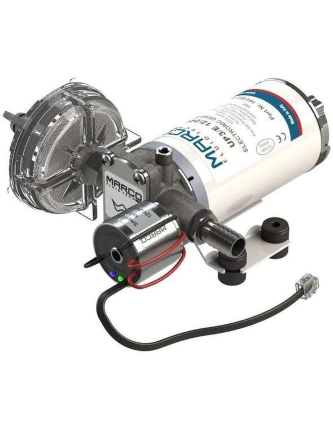 Marco UP3/E è una pompa autoclave elettronica autoadescante da 15 L/min 12/24V, ideale per impianti di acqua dolce su imbarcazioni, camper e caravan.