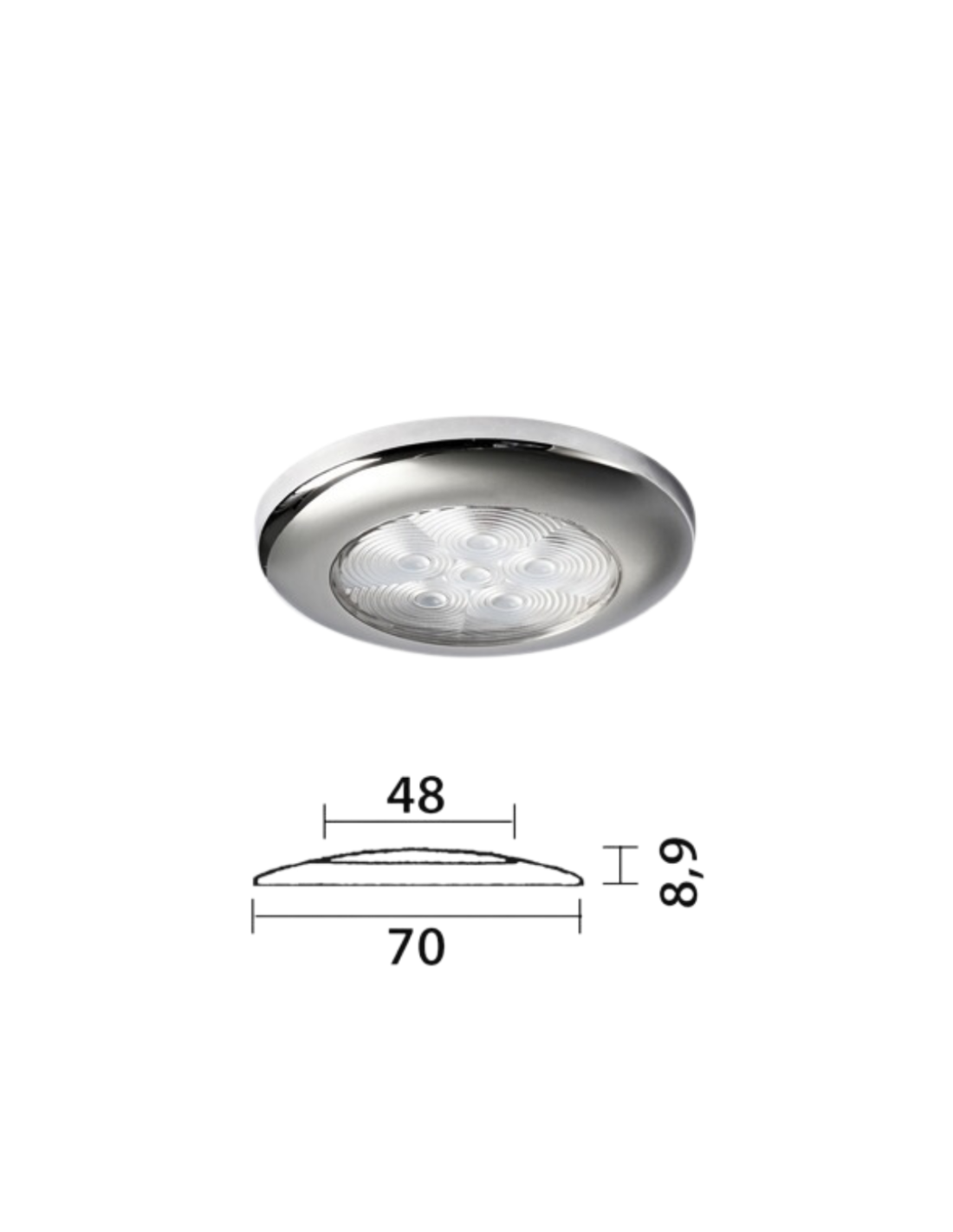 Osculati Luce di cortesia a 6 LED senza incasso, frontale in acciaio inox lucidato a specchio, luce bianco freddo.