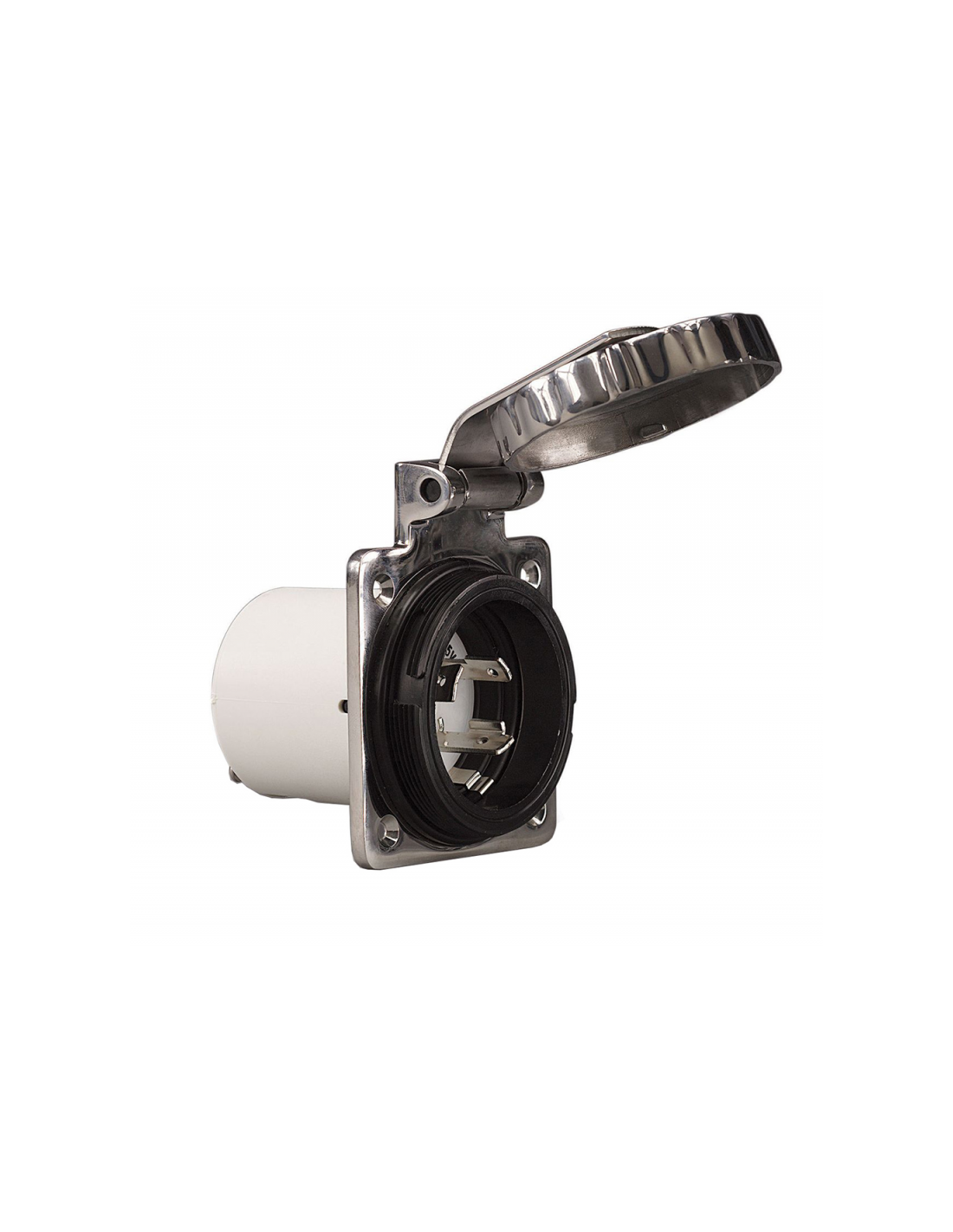 Spina ad incasso realizzata in acciaio inox AISI 316 a tre fili,con sistema Easy Lock per presa Marinco 2 poli + T .
